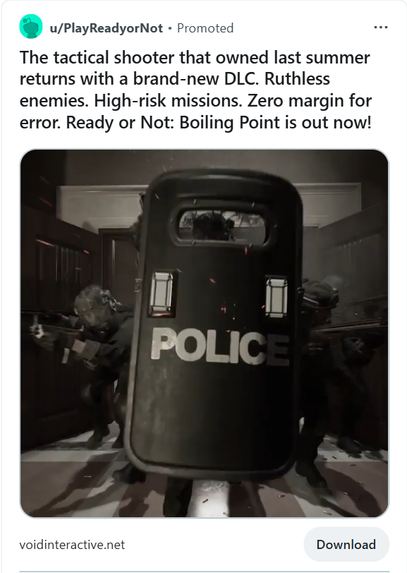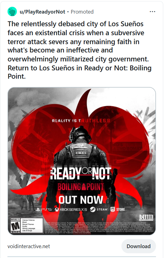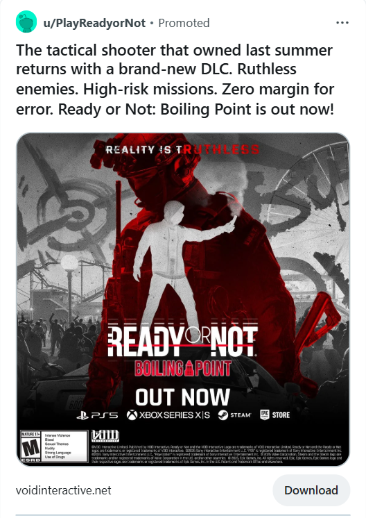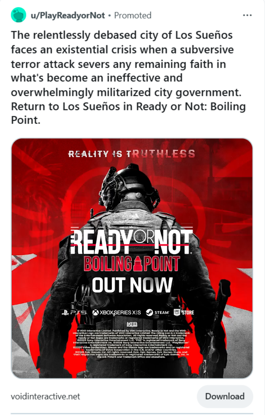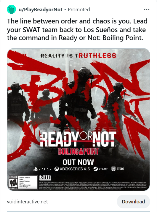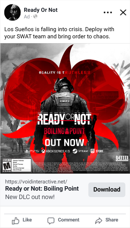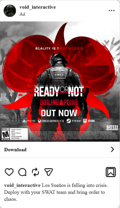 For the console launch of Ready or Not, we designed and executed a high-impact display campaign aimed at expanding awareness and driving excitement among new audiences.